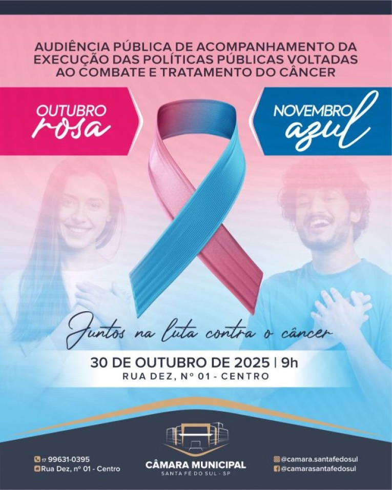 A Câmara Municipal de Santa Fé do Sul realizará, no dia 30 de outubro de 2025, às 9h, uma Audiência Pública de Acompanhamento da Execução das Políticas Públicas Voltadas ao Combate e Tratamento do Câncer.